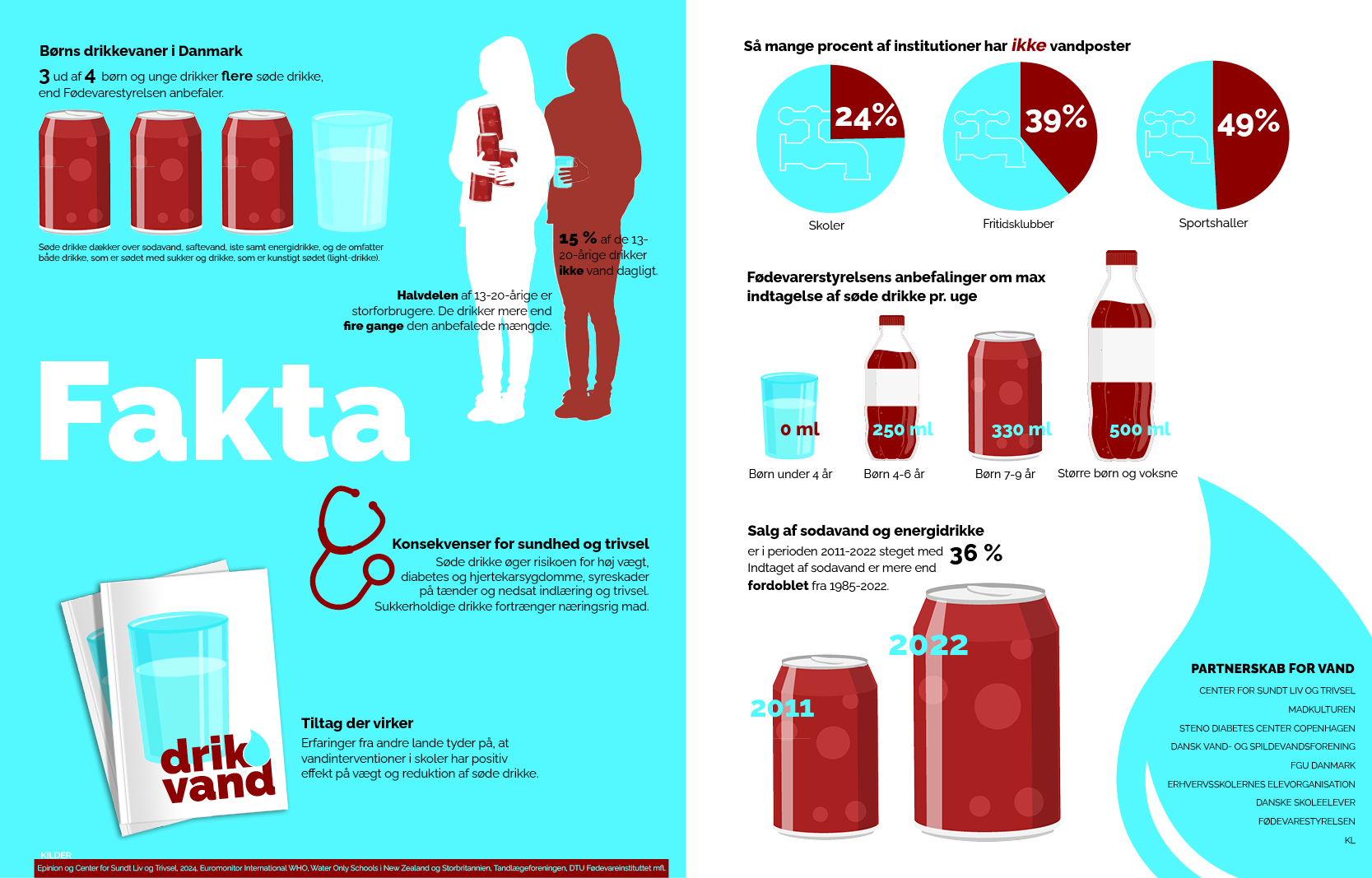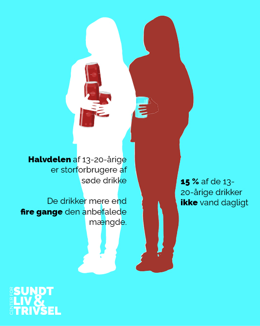 3 ud af 4 børn og unge i Danmark drikker mere sodavand, saftevand og energidrik end anbefalet. Halvdelen af de 13-20-årige er ligefrem storforbrugere med et forbrug på over to liter om ugen. Det viste en undersøgelse af børn og unges drikkevaner, som Epinion har lavet for Center for Sundt Liv og Trivsel. Derfor er vi gået med i et nyt partnerskab, der skal gøre vand til det naturlige og lette valg for børn og unge.